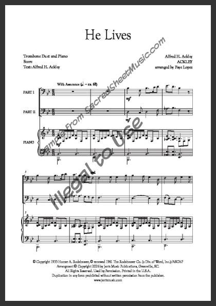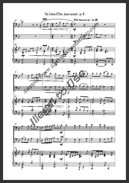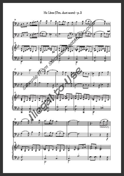 Trombone duet with piano accompaniment A bright, uplifting arrangement that celebrates Christ’s resurrection – ‘I serve a risen Savior.’. Moderately Advanced level of difficulty.