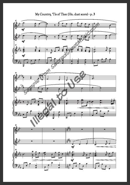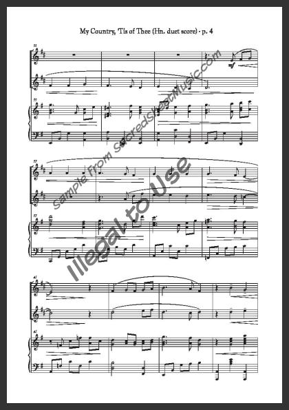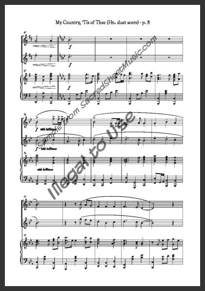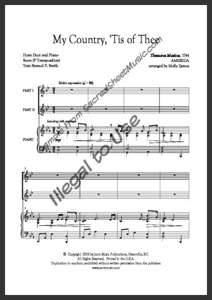 Horn duet with piano accompaniment. A powerful, fresh setting of this popular American patriotic song – “America.”. Moderately level of difficulty.