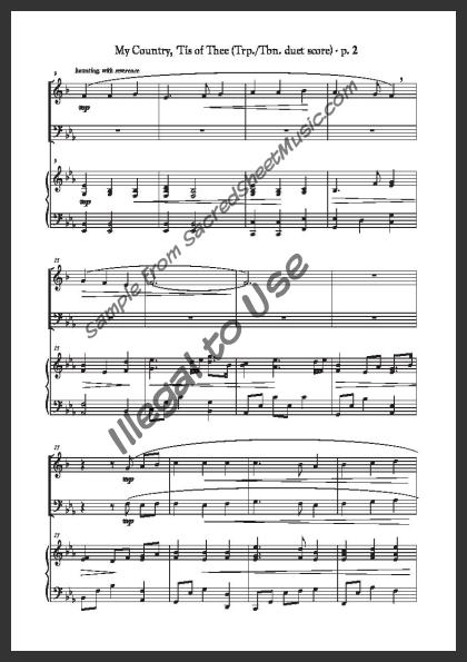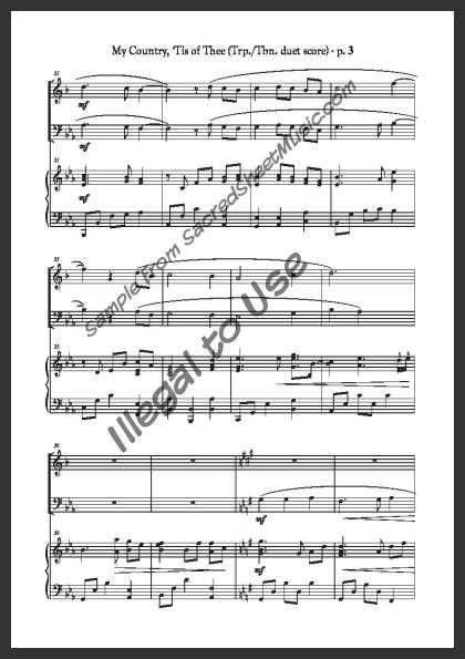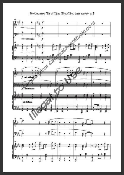 Mixed brass duet with piano accompaniment for trumpet and trombone. A powerful, fresh setting of this popular American patriotic song – “America.”. Moderately level of difficulty.